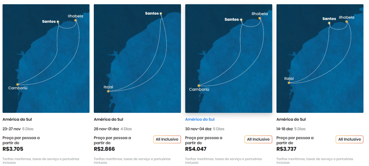 🚢 Roteiros de 3 a 9 noites com saídas de Santos, Itajaí e Rio.